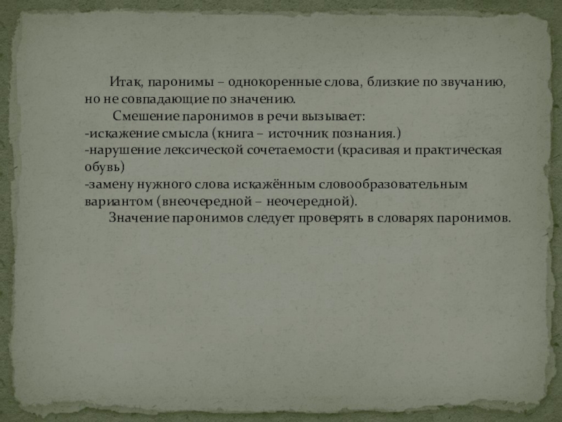 Слайд 5 Итак, паронимы – однокоренные слова, близкие по