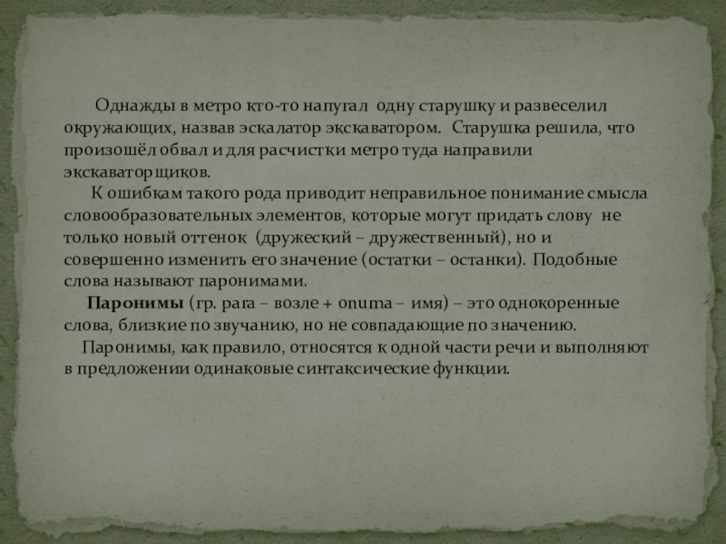К ошибкам такого рода приводит неправильное понимание смысла словообразовательных элементов, которые могут придать слову не только новый оттенок (дружеский – дружественный), но и совершенно изменить его значение (остатки – останки). Подобные слова называют паронимами.
