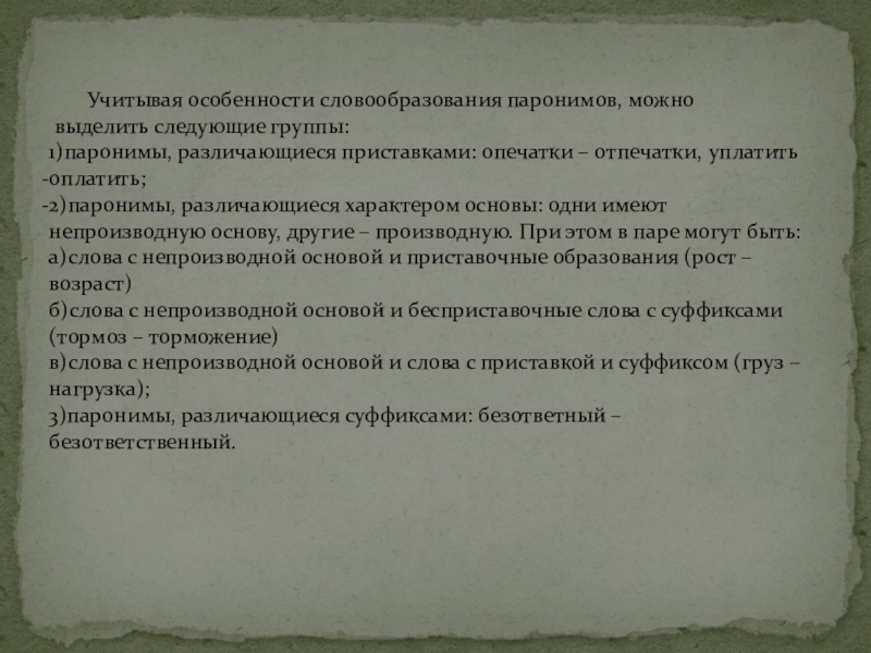 Слайд 3 Учитывая особенности словообразования паронимов, можно