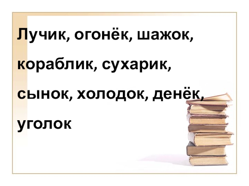 Слайд 3Лучик, огонёк, шажок, кораблик, сухарик, сынок, холодок, денёк, уголок