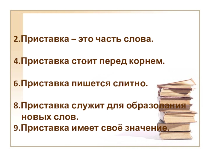 2.Приставка – это часть слова.4.Приставка стоит перед корнем.6.Приставка пишется слитно.8.Приставка служит для образования новых слов.9.Приставка имеет своё