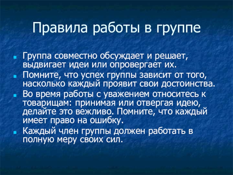 Помните, что успех группы зависит от того, насколько каждый проявит свои достоинства.