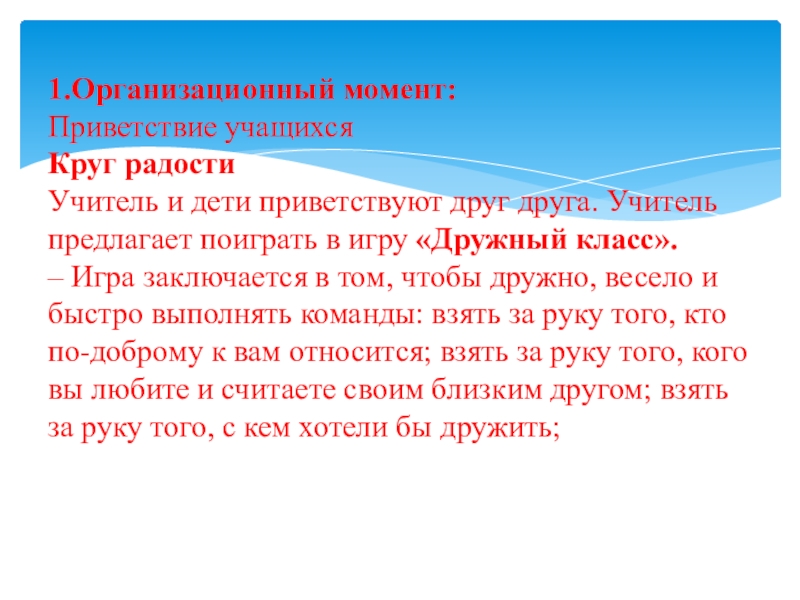 – Игра заключается в том, чтобы дружно, весело и быстро выполнять команды: взять за руку того, кто по-доброму к вам относится; взять за руку того, кого вы любите и считаете своим близким другом; взять за руку того, с кем хотели бы дружить; изобразить лучшего друга и т.д.