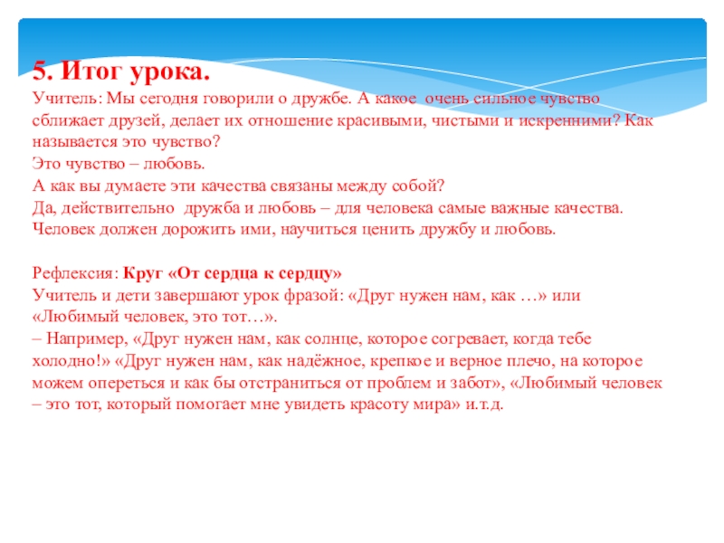 Учитель и дети завершают урок фразой: «Друг нужен нам, как …» или «Любимый человек, это тот…».