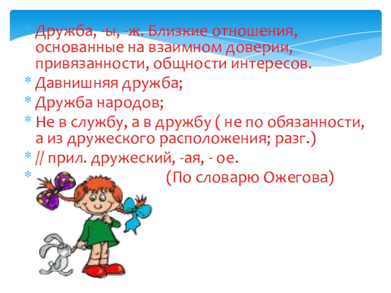 Слайд 7Дружба, -ы, -ж. Близкие отношения, основанные на взаимном доверии, привязанности, общности