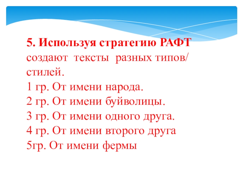 Слайд 105. Используя стратегию РАФТ создают тексты разных типов/ стилей.