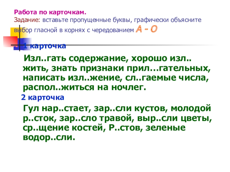 Изл..гать содержание, хорошо изл..жить, знать признаки прил…гательных, написать изл..жение, сл..гаемые числа, распол..житься на ночлег.