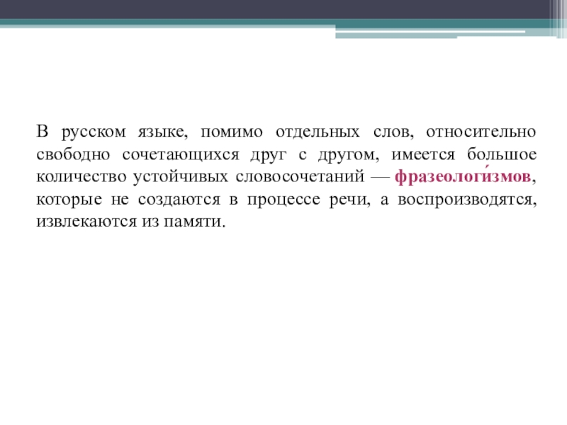 В русском языке, помимо отдельных слов, относительно свободно сочетающихся друг с другом, имеется большое количество устойчивых словосочетаний