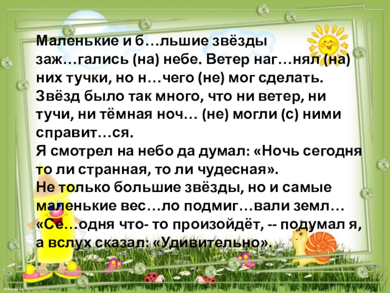 тучки, но н…чего (не) мог сделать. Звёзд было так много, что ни ветер, ни тучи, ни тёмная ноч… (не) могли (с) ними справит…ся.