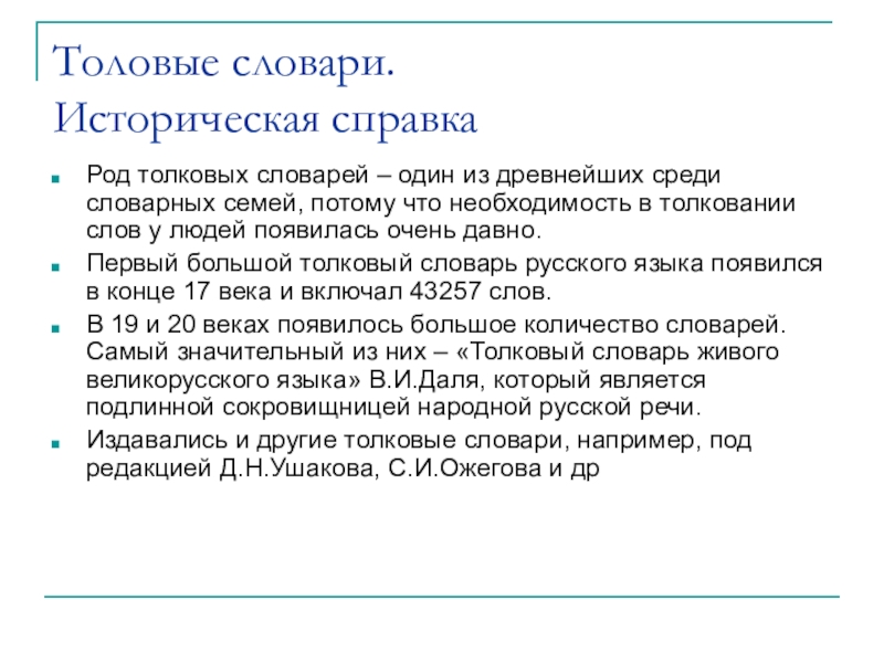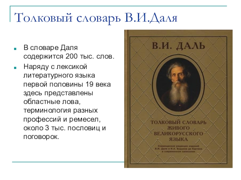 В 19 и 20 веках появилось большое количество словарей. Самый значительный из них – «Толковый словарь живого великорусского языка» В.И.Даля, который является подлинной сокровищницей народной русской речи.