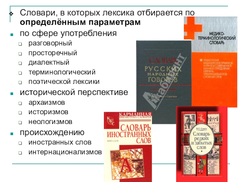 Слайд 6Словари, в которых лексика отбирается по определённым параметрам