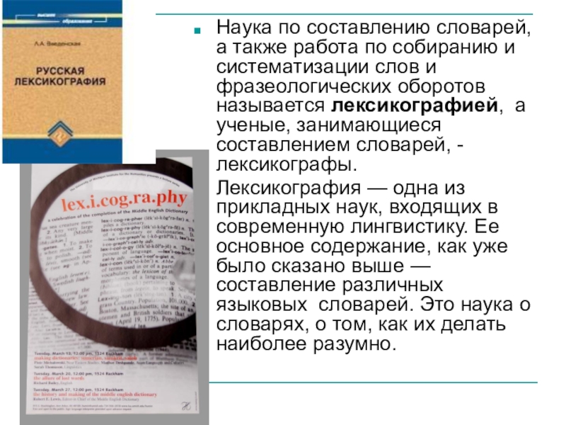 слов и фразеологических оборотов называется лексикографией, а ученые, занимающиеся составлением словарей, - лексикографы.