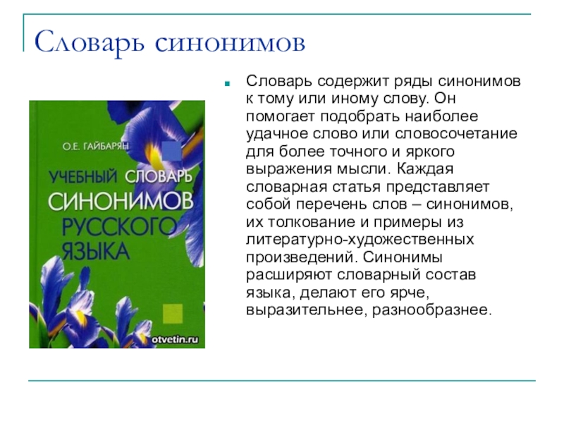 помогает подобрать наиболее удачное слово или словосочетание для более точного и яркого выражения мысли. Каждая словарная статья представляет собой перечень слов – синонимов, их толкование и примеры из литературно-художественных произведений. Синонимы расширяют словарный состав языка, делают его ярче, выразительнее, разнообразнее.