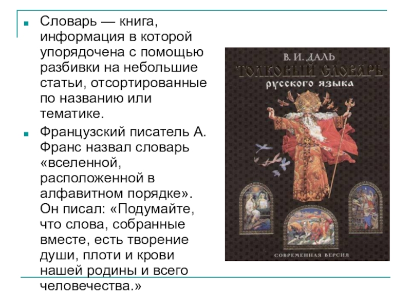 Французский писатель А. Франс назвал словарь «вселенной, расположенной в алфавитном порядке». Он писал: «Подумайте, что слова, собранные вместе, есть творение души, плоти и крови нашей родины и всего человечества.»