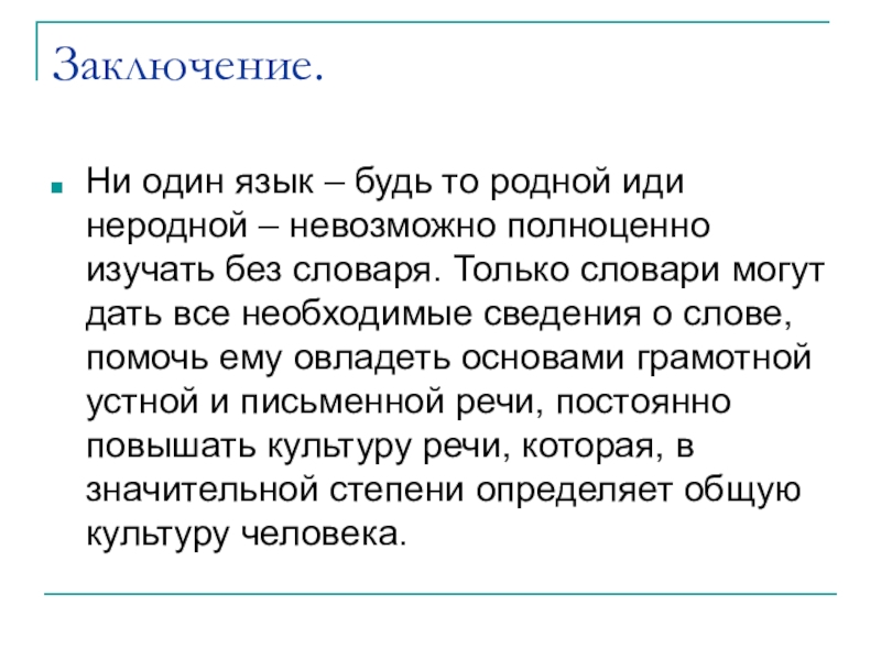 полноценно изучать без словаря. Только словари могут дать все необходимые сведения о слове, помочь ему овладеть основами грамотной устной и письменной речи, постоянно повышать культуру речи, которая, в значительной степени определяет общую культуру человека.