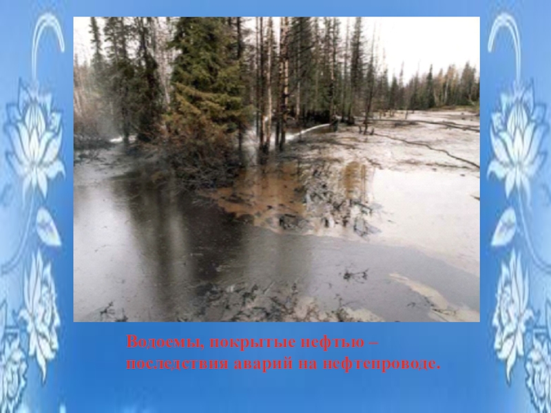 Слайд 27Водоемы, покрытые нефтью – последствия аварий на нефтепроводе.