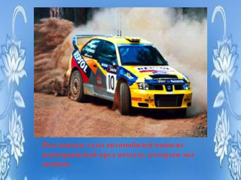 Слайд 28Выхлопные газы автомобилей наносят непоправимый вред воздуху, которым мы дышим.