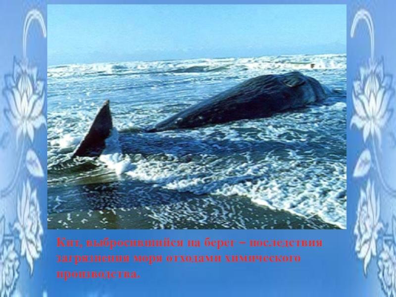 Слайд 26Кит, выбросившийся на берег – последствия загрязнения моря отходами химического производства.