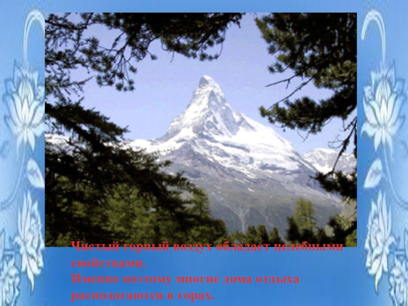 Слайд 13Чистый горный воздух обладает целебными свойствами.