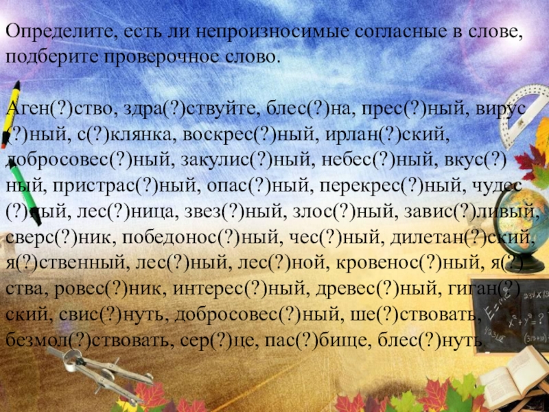 Слайд 8Определите, есть ли непроизносимые согласные в слове, подберите проверочное слово.