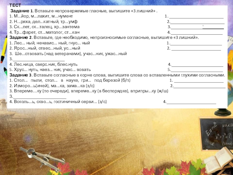Задание 1. Вставьте непроверяемые гласные, выпишите «3 лишний» .