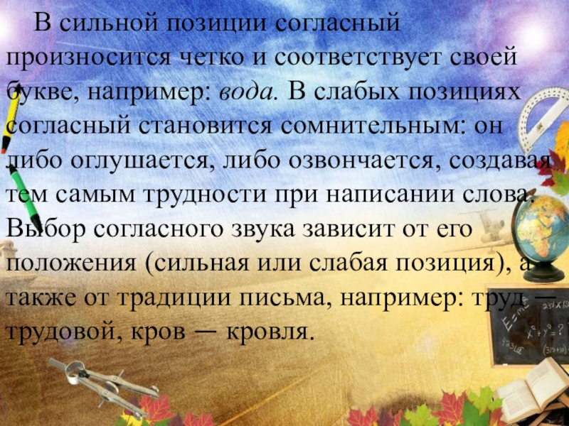 вода. В слабых позициях согласный становится сомнительным: он либо оглушается, либо озвончается, создавая тем самым трудности при написании слова. Выбор согласного звука зависит от его положения (сильная или слабая позиция), а также от традиции письма, например: труд — трудовой, кров — кровля.
