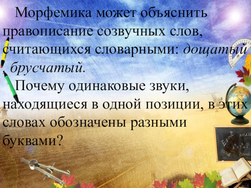 Слайд 12Морфемика может объяснить правописание созвучных слов, считающихся словарными: дощатый , брусчатый.