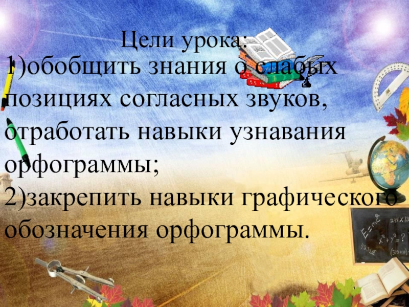 Слайд 21)обобщить знания о слабых позициях согласных звуков, отработать навыки узнавания орфограммы;