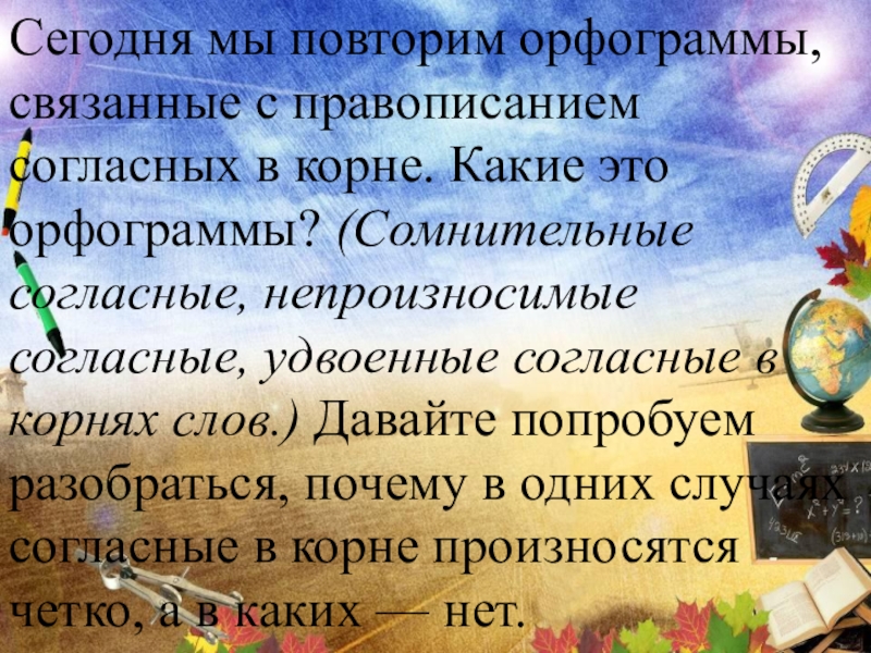 Слайд 6Сегодня мы повторим орфограммы, связанные с правописанием согласных в корне. Какие