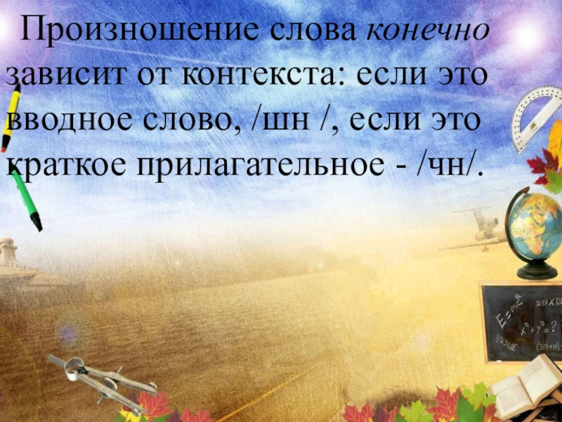 Слайд 4Произношение слова конечно зависит от контекста: если это вводное слово, /шн