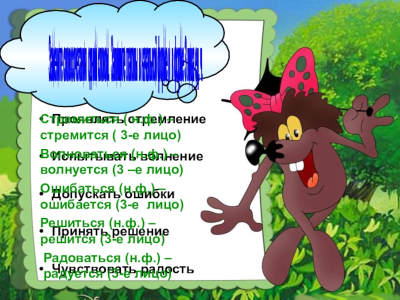 Замените словосочетания одним словом. Запишите глаголы в начальной форме и в форме 3 лица ед. ч.