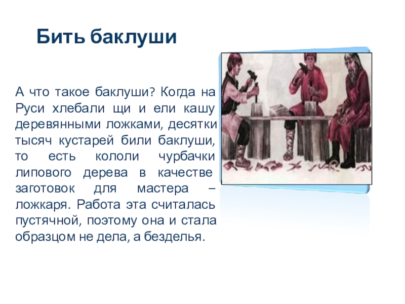 и ели кашу деревянными ложками, десятки тысяч кустарей били баклуши, то есть кололи чурбачки липового дерева в качестве заготовок для мастера – ложкаря. Работа эта считалась пустячной, поэтому она и стала образцом не дела, а безделья.