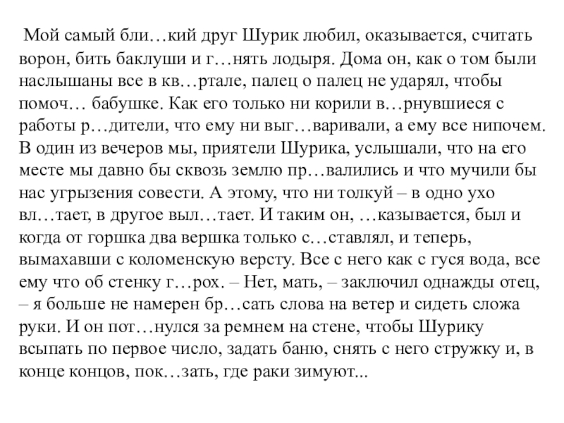 баклуши и г…нять лодыря. Дома он, как о том были наслышаны все в кв…ртале, палец о палец не ударял, чтобы помоч… бабушке. Как его только ни корили в…рнувшиеся с работы р…дители, что ему ни выг…варивали, а ему все нипочем. В один из вечеров мы, приятели Шурика, услышали, что на его месте мы давно бы сквозь землю пр…валились и что мучили бы нас угрызения совести. А этому, что ни толкуй – в одно ухо вл…тает, в другое выл…тает. И таким он, …казывается, был и когда от горшка два вершка только с…ставлял, и теперь, вымахавши с коломенскую версту. Все с него как с гуся вода, все ему что об стенку г…рох. – Нет, мать, – заключил однажды отец, – я больше не намерен бр…сать слова на ветер и сидеть сложа руки. И он пот…нулся за ремнем на стене, чтобы Шурику всыпать по первое число, задать баню, снять с него стружку и, в конце концов, пок…зать, где раки зимуют...