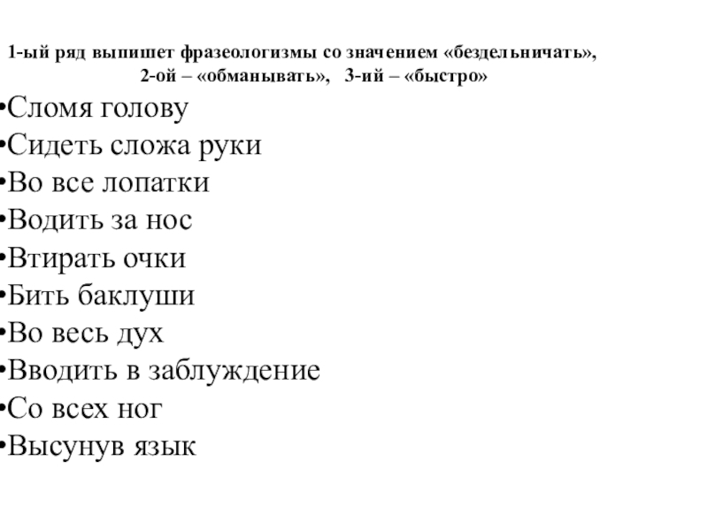 1-ый ряд выпишет фразеологизмы со значением «бездельничать»,