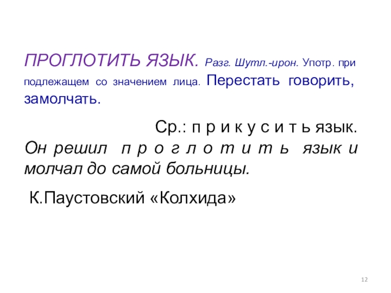 Слайд 12ПРОГЛОТИТЬ ЯЗЫК. Разг. Шутл.-ирон. Употр. при подлежащем со значением лица. Перестать