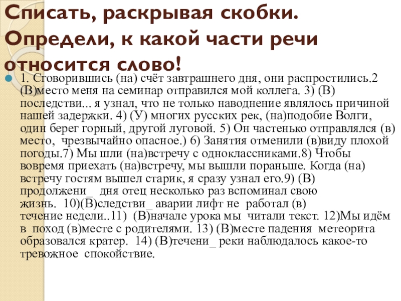 Слайд 27Списать, раскрывая скобки. Определи, к какой части речи относится слово!