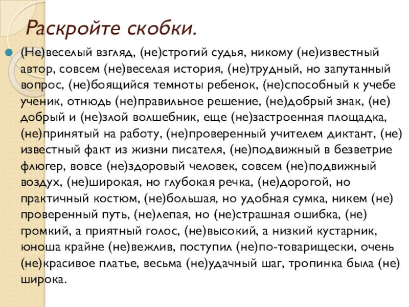 (не)трудный, но запутанный вопрос, (не)боящийся темноты ребенок, (не)способный к учебе ученик, отнюдь (не)правильное решение, (не)добрый знак, (не)добрый и (не)злой волшебник, еще (не)застроенная площадка, (не)принятый на работу, (не)проверенный учителем диктант, (не)известный факт из жизни писателя, (не)подвижный в безветрие флюгер, вовсе (не)здоровый человек, совсем (не)подвижный воздух, (не)широкая, но глубокая речка, (не)дорогой, но практичный костюм, (не)большая, но удобная сумка, никем (не)проверенный путь, (не)лепая, но (не)страшная ошибка, (не)громкий, а приятный голос, (не)высокий, а низкий кустарник, юноша крайне (не)вежлив, поступил (не)по-товарищески, очень (не)красивое платье, весьма (не)удачный шаг, тропинка была (не)широка.