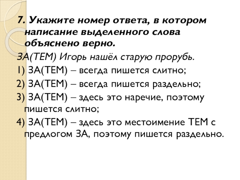 Слайд 347. Укажите номер ответа, в котором написание выделенного слова объяснено верно.