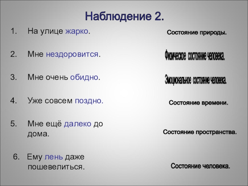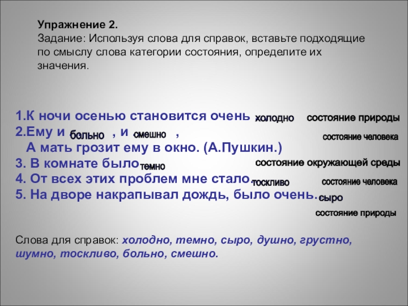 Слова для справок: холодно, темно, сыро, душно, грустно,
