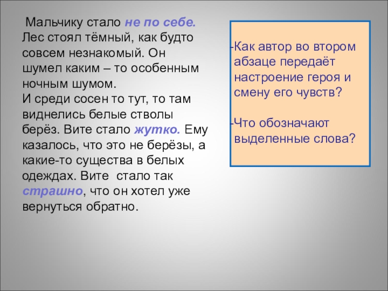 И среди сосен то тут, то там виднелись белые стволы берёз. Вите стало . Ему казалось, что это не берёзы, а какие-то существа в белых одеждах. Вите стало так , что он хотел уже вернуться обратно.