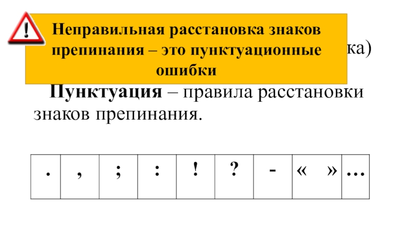 Пунктуация (от лат. пунктум – точка)  	Пунктуация – правила расстановки знаков препинания.Неправильная расстановка знаков