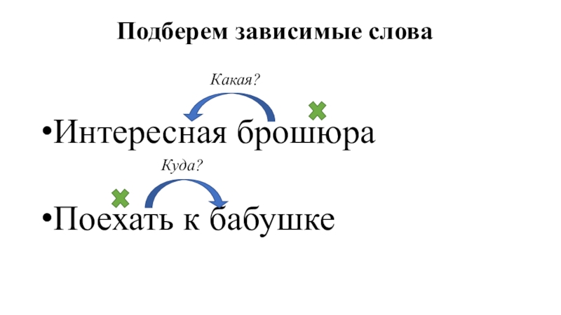 Подберем зависимые словаИнтересная брошюраПоехать к бабушкеКакая?Куда?