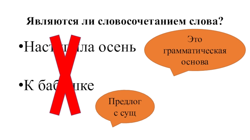 Являются ли словосочетанием слова?Наступила осеньК бабушкеЭто грамматическая основа Предлог с сущ