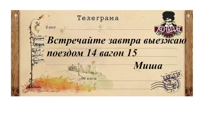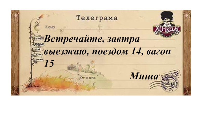 Слайд 19Встречайте, завтра выезжаю, поездом 14, вагон 15