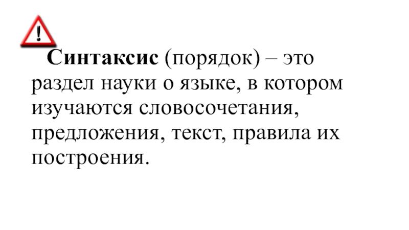 Синтаксис (порядок) – это раздел науки о языке, в котором изучаются словосочетания, предложения, текст, правила их построения.