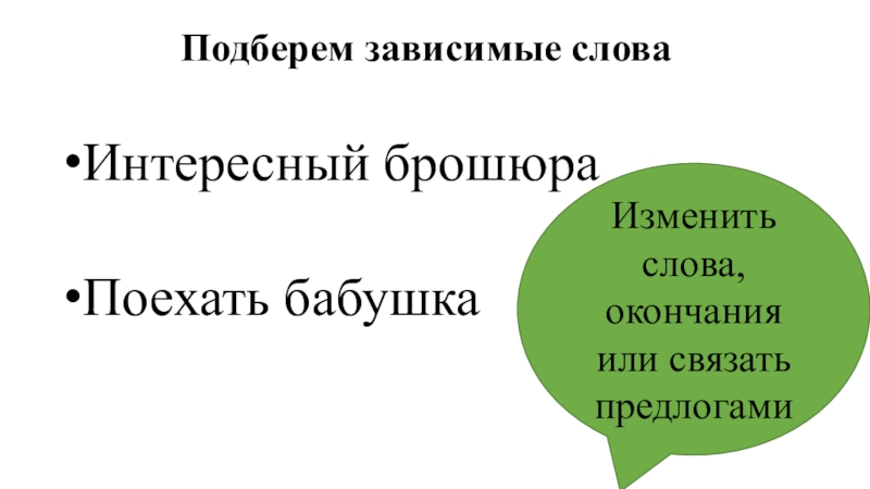 Подберем зависимые словаИнтересный брошюраПоехать бабушкаИзменить слова, окончания или связать предлогами