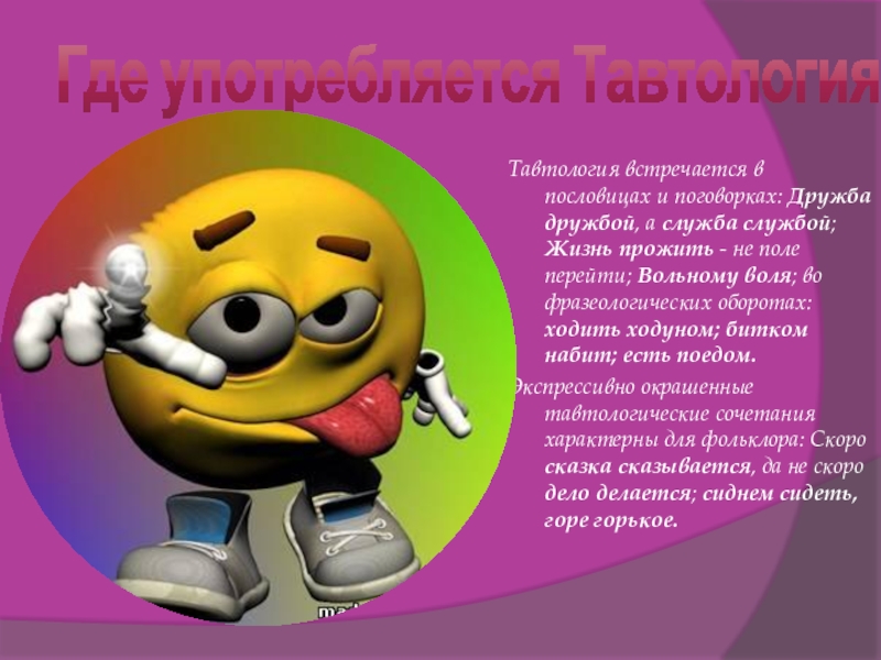 Тавтология представляет собой лексическую ошибку, если употребление однокоренных слов не оправдано стилистическими целями и носит случайный характер: воедино соединять, станцевать танец, по-спортивному относится к спорту, подтвердить утверждение. Обычно о непреднамеренной тавтологии говорят так: масло масляное.