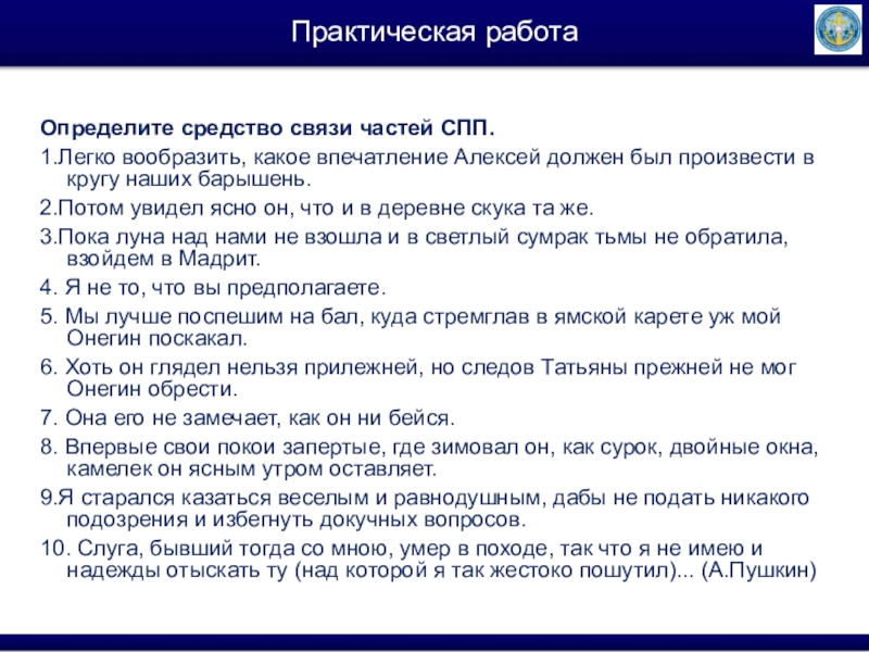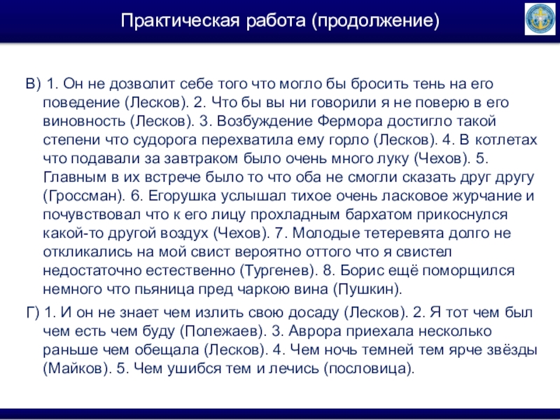 бы бросить тень на его поведение (Лесков). 2. Что бы вы ни говорили я не поверю в его виновность (Лесков). 3. Возбуждение Фермора достигло такой степени что судорога перехватила ему горло (Лесков). 4. В котлетах что подавали за завтраком было очень много луку (Чехов). 5. Главным в их встрече было то что оба не смогли сказать друг другу (Гроссман). 6. Егорушка услышал тихое очень ласковое журчание и почувствовал что к его лицу прохладным бархатом прикоснулся какой-то другой воздух (Чехов). 7. Молодые тетеревята долго не откликались на мой свист вероятно оттого что я свистел недостаточно естественно (Тургенев). 8. Борис ещё поморщился немного что пьяница пред чаркою вина (Пушкин).