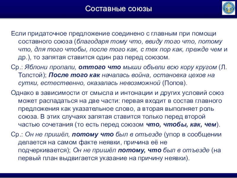 Однако в зависимости от смысла и интонации и других условий союз может распадаться на две части: первая входит в состав главного предложения как указательное слово, а вторая выполняет роль союза. В этих случаях запятая ставится только перед второй частью сочетания (то есть перед союзом что, чтобы, как, чем).