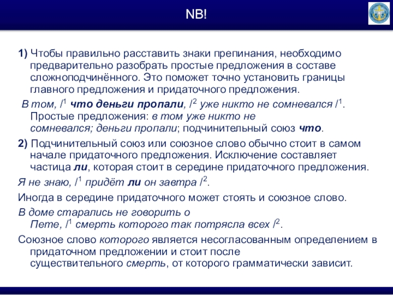 Союзы и союзные слова обычно стоят в начале придаточного предложения и служат показателем границы между главным и придаточным.